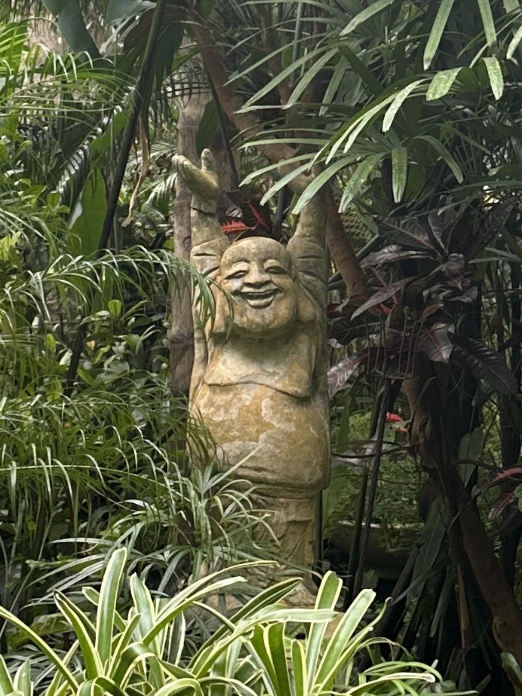 A peaceful botanical garden tucked inside a sinkhole, filled with towering palms, lush vegetation, smiling buddhas and quiet corners perfect for wandering.