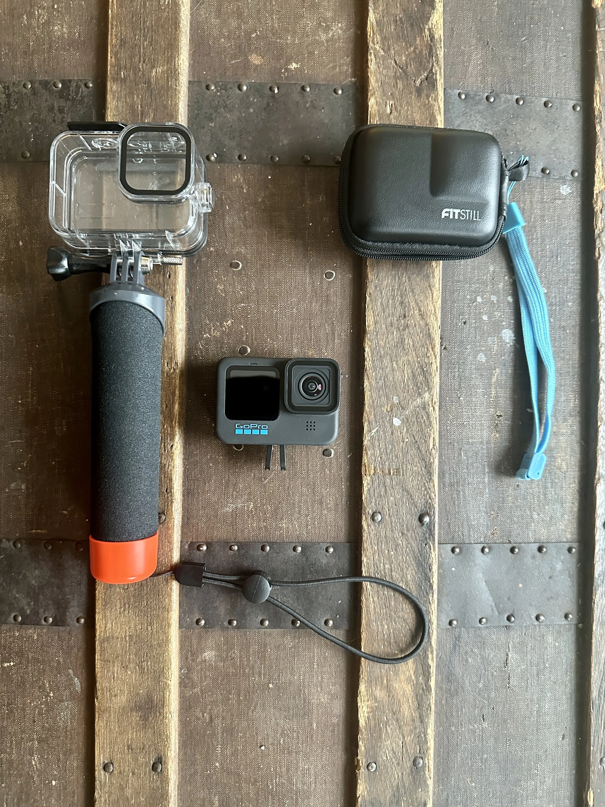I love the hard carrying case I purchased separately for travel day protection. For extra peace of mind, you can add a waterproof case, lens filters, and a floatable handle. We also recommend the all-in-one accessory kit (not pictured), which includes mounts, straps, stands, anti-fog inserts, and just about everything you could need for capturing your outdoor adventures.